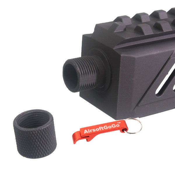- It has a 20mm mount base on the top and a 14mm reverse thread silencer attachment on the tip.